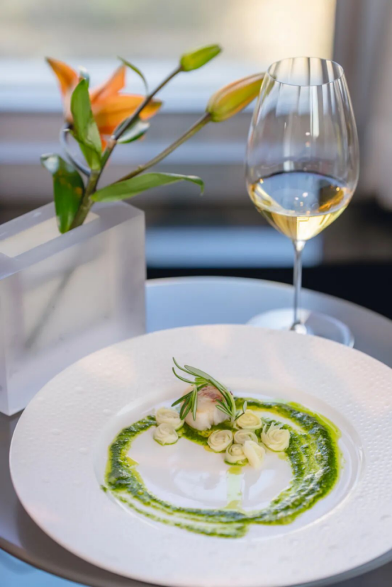 粤菜注重食材本味,讲究清鲜平和,歌海娜干白可凸显食材鲜甜又不掩盖菜肴风味。像今天大董的带子,肉质滑嫩,搭配冰镇的干白和桃红歌海娜各有风味,白歌海娜葡萄酒的白花香气与矿物味,能和带子肉的鲜嫩形成互补,奶油般的质地也让整体口感更圆润顺滑。桃红歌海娜覆盆子果香能中和酱汁海鲜的丰腴,酸度还能激活食材本身的鲜嫩。