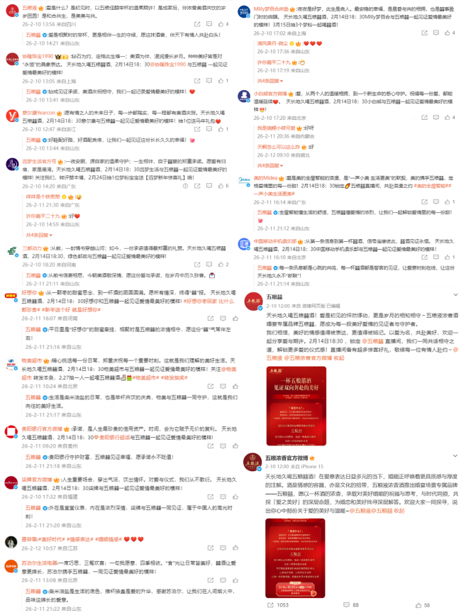 品牌发布期间,五粮囍怀揣弘扬优秀婚恋观的初心,在官微发出一份关于“爱与长久”的开放式倡议,意外引发近50位不同领域企业蓝V的主动共同发声。在这场温暖互动中,五粮囍更像是一个倡议的发起者,而后被智慧家电、国潮运动、风尚服饰、珠宝文旅、品质家居等众多同行者真诚的表达,共同推到了公众视野的中央,形成“众星捧月”的热点效应。这场源于共同理念的“隔空对话”,不仅放大了社会对健康文明婚恋观的关注,也生动展现了当代企业向上、向善的价值追求。